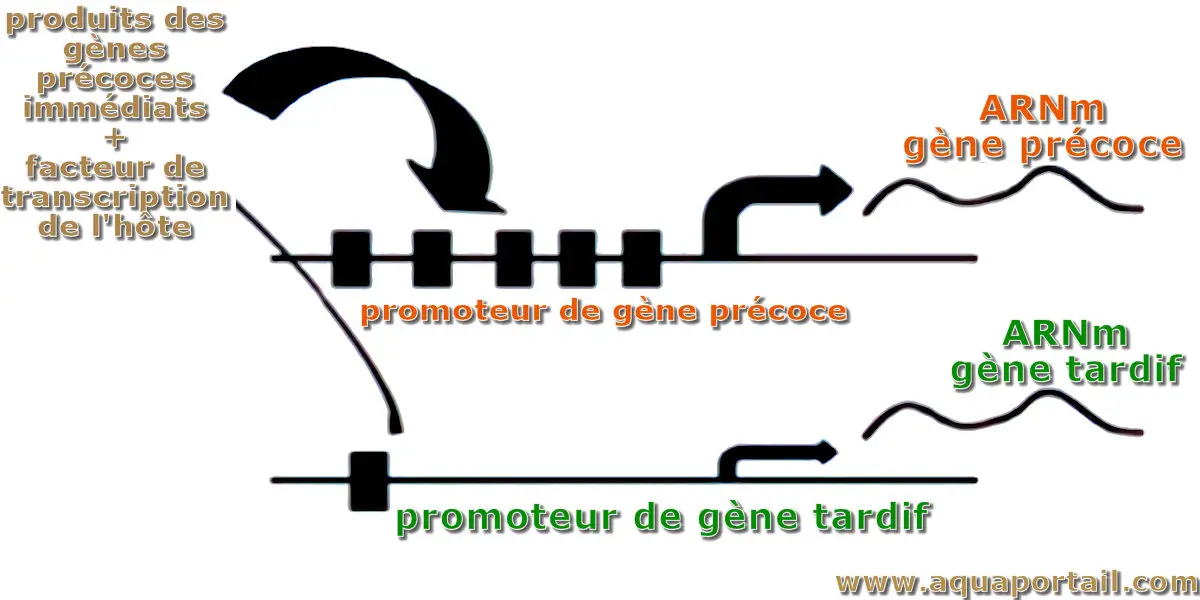 Différence structurelle entre le promoteur du gène précoce et le promoteur du gène tardif. Le moment de l'expression des gènes précoce et tardif est déterminé par la structure de leurs promoteurs. Dans le promoteur du gène précoce, les sites de liaison du facteur de transcription sont répétés en tandem. Le nombre de sites de liaison dans le promoteur du gène tardif est inférieur à celui du promoteur du gène précoce.
