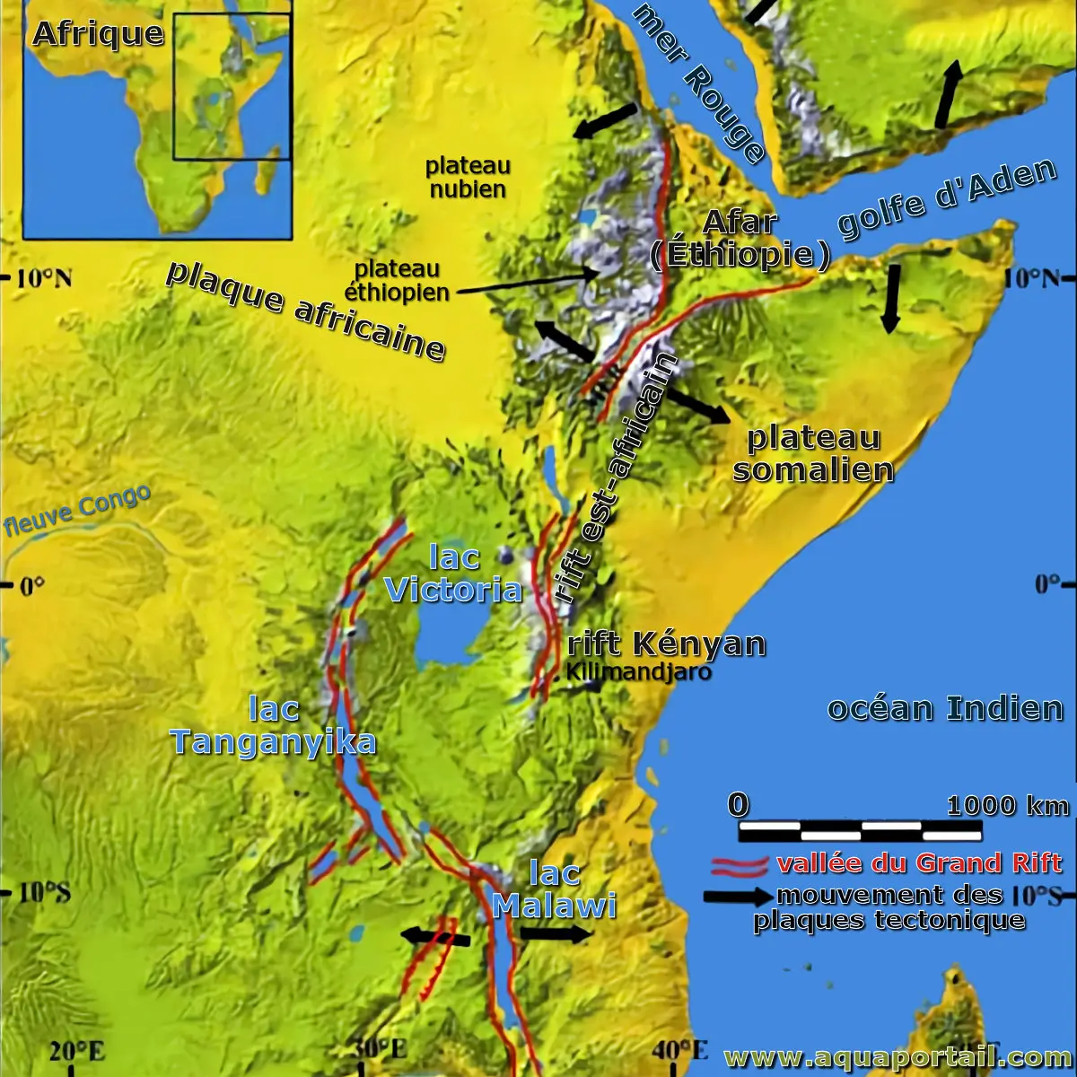 La vallée du Grand Rift est-africain traversent de nombreux pays : Érythrée, Djibouti, Éthiopie, Kenya, Tanzanie, Ouganda, Rwanda, Burundi, République démocratique du Congo (RDC), Malawi, Zambie, Mozambique.
