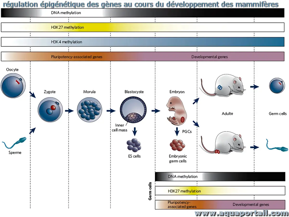 Aux premiers stades du développement, la méthylation de l'ADN est systématiquement effacée, permettant l'activation des gènes associés à la pluripotence, tandis que les gènes du développement sont supprimés par le système protéique PcG et la méthylation de H3K27. À mesure que les cellules pluripotentes, comme les cellules souches embryonnaires, se différencient, les gènes associés à la pluripotence sont inactivés, souvent de manière permanente, par la méthylation de l'ADN. Parallèlement, les gènes du développement sont activés, ce qui s'accompagne d'une augmentation de la méthylation de H3K4.