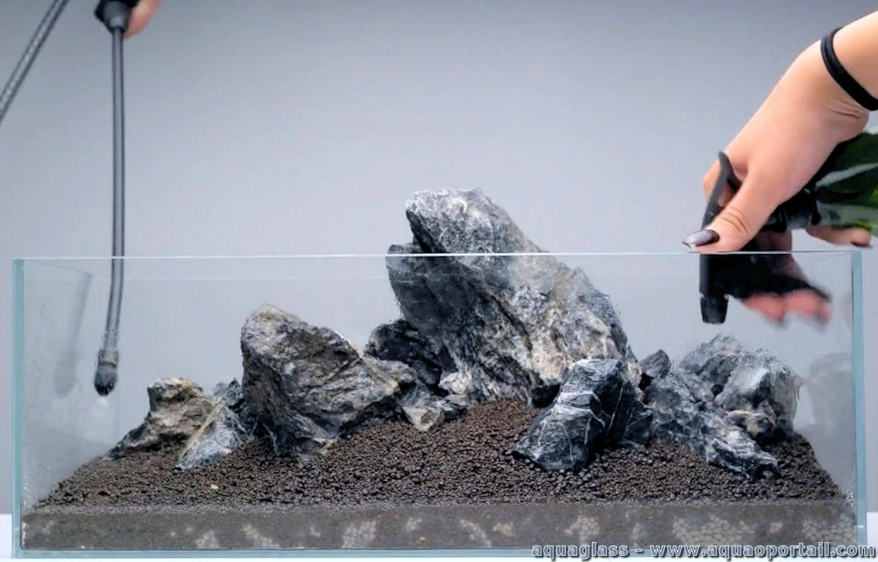Assurez-vous que vous êtes satisfait de votre look final car une fois que les plantes aquatiques sont ajoutées et commencent à pousser, il est préférable de ne pas perturber la disposition ou le sol. Ensuite, vaporisez le sol du substrat jusqu'à ce qu'il soit complètement humide, pas inondé, mais suffisamment humide pour que le haut du sol jusqu'au fond du substrat soit visiblement humide. Vous pouvez voir cela intervenir à travers le réservoir de l'aquarium. La plupart des substrats noirciront une fois mouillés.