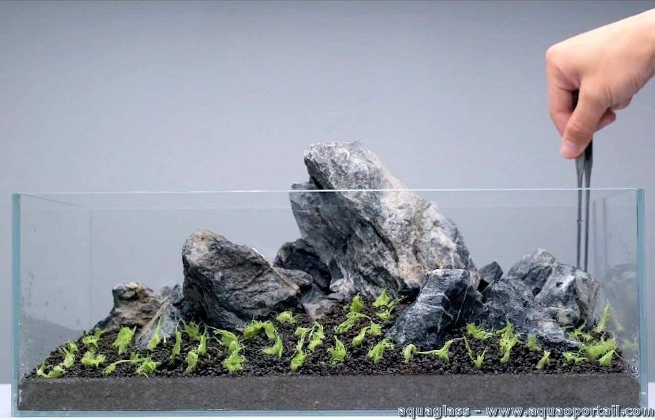 J'ai correctement brumisé et le sol semble humide et il n'y a pas de flaques d'eau visibles : il est maintenant temps de passer à l'étape de plantation de vos plantes. Lee DSM fonctionne exceptionnellement bien avec les tapis de plantes gazonnantes. Dans la méthode présentée ici, il s'agit de Utricularia graminifolia. L'emploi d'une pince spécifique à l'aquascape est très utile pour enfoncer les plantules dans le sol.