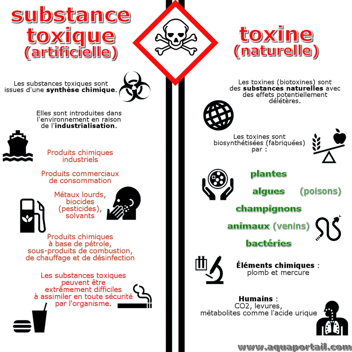 La "substance toxique" concerne uniquement les produits synthétiques fabriqués par l'Homme. Une toxine est naturelle, mais une substance toxique est artificielle. Les substances toxiques peuvent être extrêmement difficiles à assimiler en toute sécurité par l'organisme.