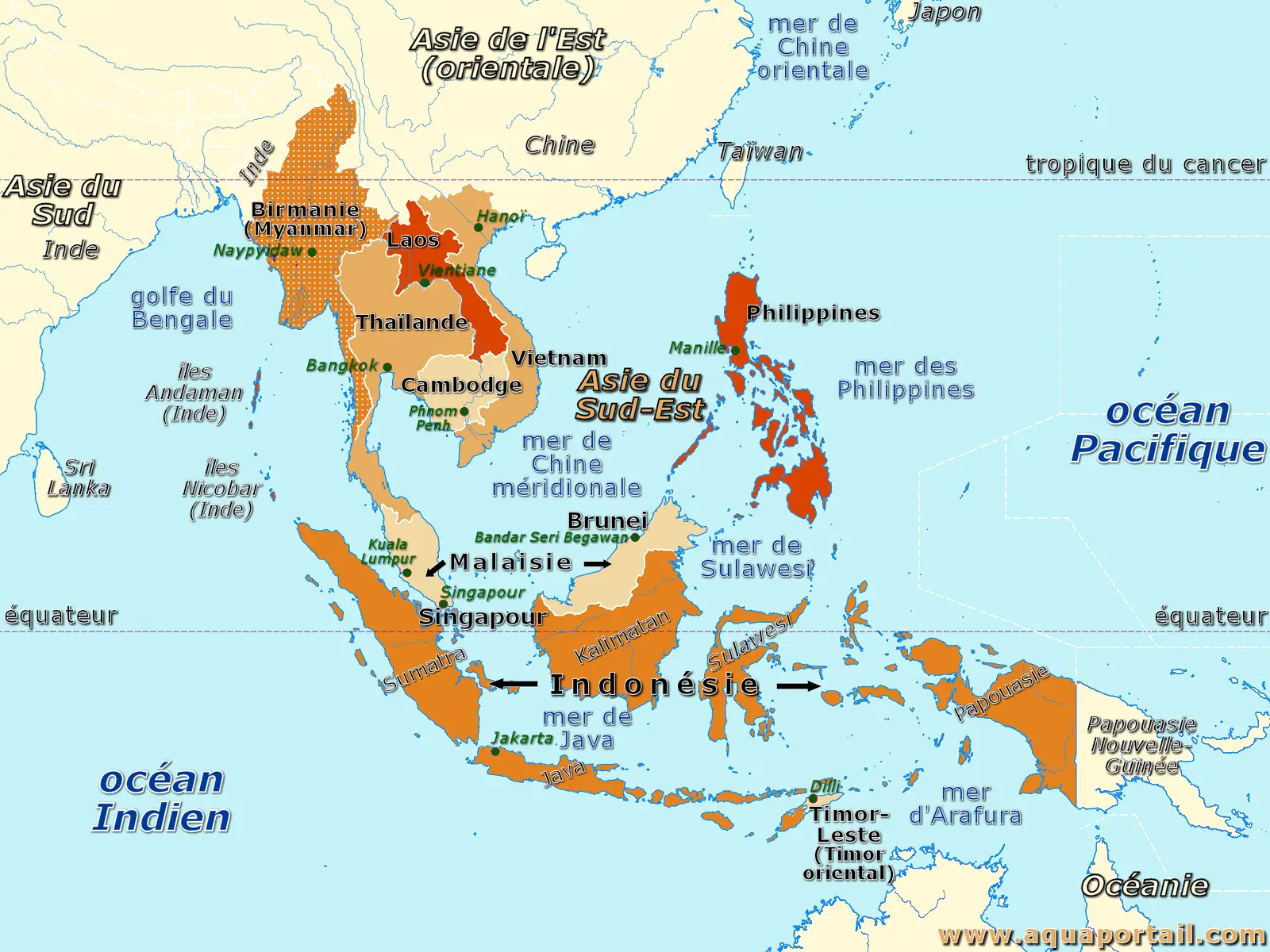 - Asie du Sud-Est maritime de l'archipel malais, qui comprend l'Indonésie et les Philippines. La Malaisie orientale et le Brunei partagent Bornéo avec l'Indonésie. Singapour et le Timor-Lest (Timor oriental) font également partie de cette région.