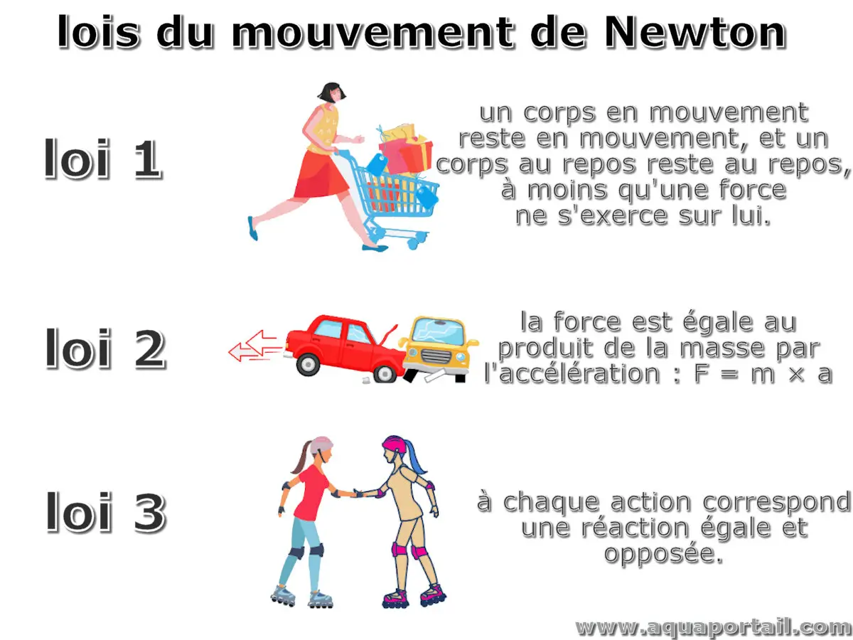 Les trois lois de Newton expliquent qu'un mouvement est régi par la loi d'inertie, la force qui est produite par la masse et l'accélération, et la loi d'action-réaction.