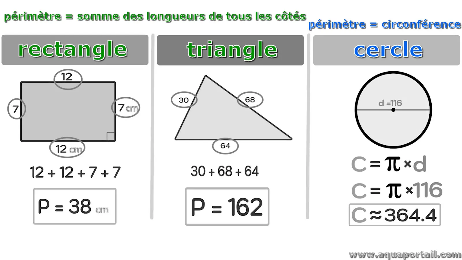 Le périmètre d'une figure géométrique fermée est la ligne continue qui limite la figure (plane, en deux dimensions). Par exemple, le périmètre d'un rectangle, d'un triangle ou d'un cercle.