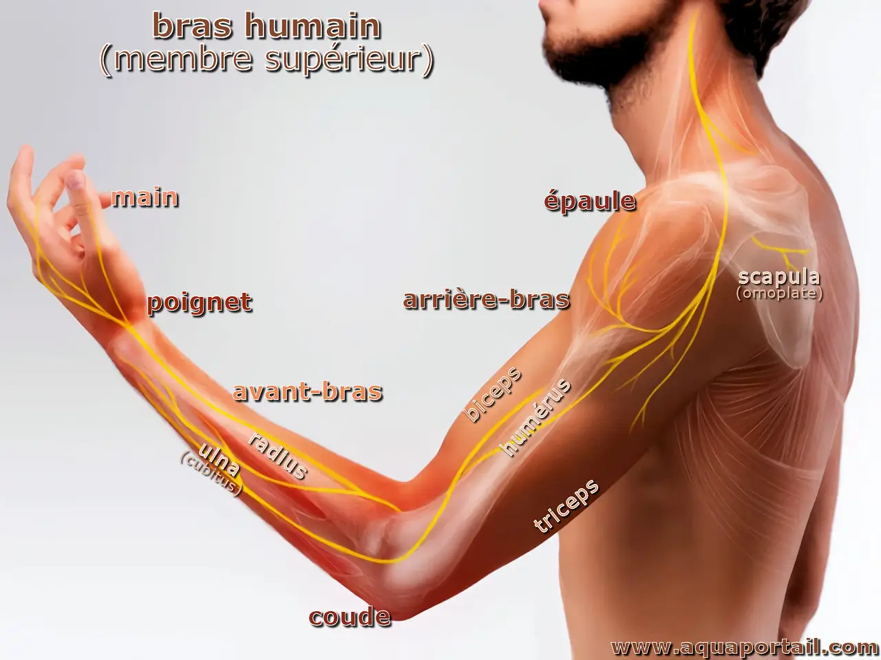 La partie d'un bras entre les articulations de l'épaule et du coude est appelée "arrière-bras" ou "bras". La partie entre le coude et le poignet est appelée "avant-bras". La main est son extrémité distale.