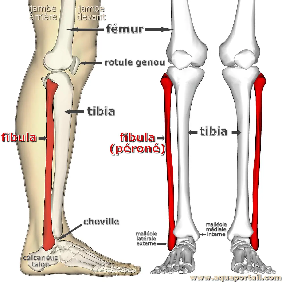 La fibula (péroné) est le plus petit des deux os zeugopode du bas d'une jambe, derrière le tibia et recouvert par le mollet, s'étendant du genou à la face externe de la cheville Fibula et tibia prolonge la jambe au dessous du fémur. Elle supporte les muscles du mollet et accueille, à son extrémité distale, la malléole externe (latérale). Elle stabilise la cheville et soutient les muscles de la jambe.