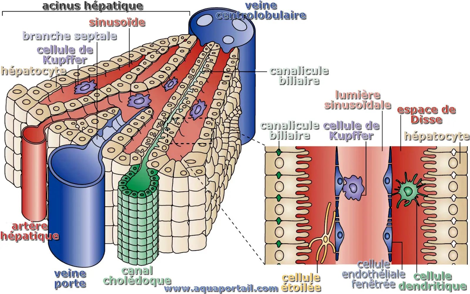 Les hépatocytes sont disposés radialement pour former la lame hépatique et les sinusoïdes. Les veines portes et les branches de l'artère hépatique se terminent dans les sinusoïdes, drainant le sang vers ces derniers puis, par l'acinus, vers la veine centrolobulaire. Les sinusoïdes sont tapissés de cellules endothéliales sinusoïdales hépatiques fenêtrées, sur lesquelles sont intercalées des cellules de Kupffer. Entre la lame hépatique et les sinusoïdes se trouve l'espace de Disse, contenant les composants de la matrice extracellulaire et les cellules étoilées hépatiques.