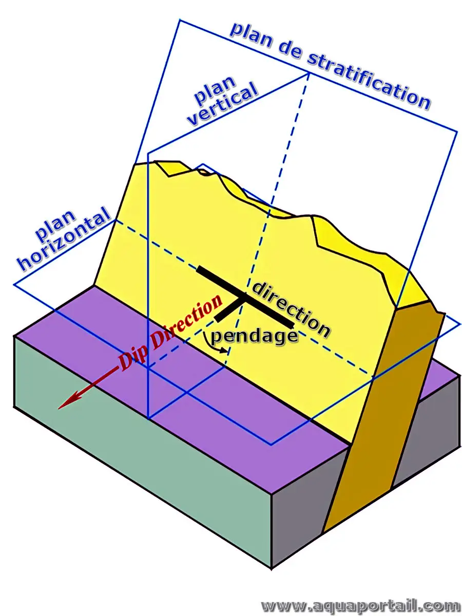 La direction désigne la direction horizontale de la surface rocheuse et sert de référence pour mesurer la direction du pendage.