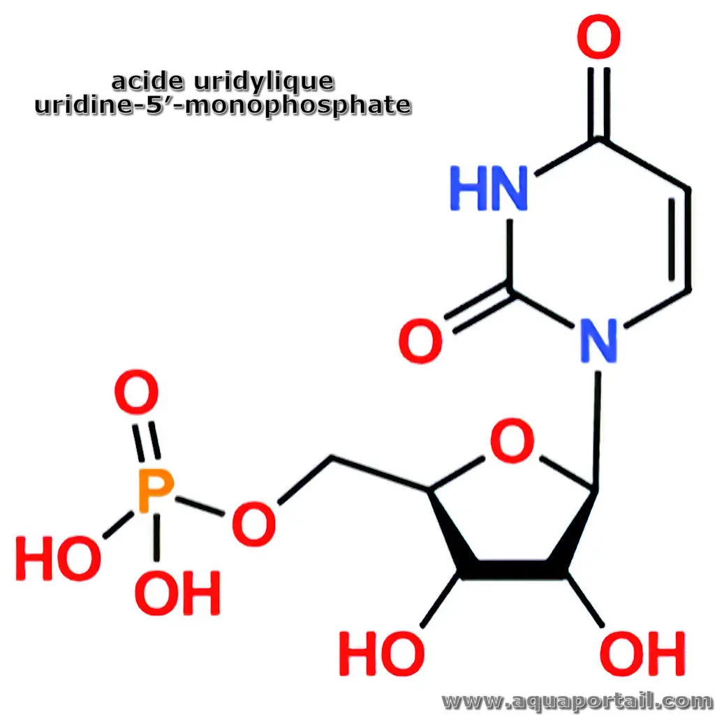 L'uridine monophosphate se présente comme un sous-produit du métabolisme de certaines bactéries, de la biosynthèse des peptidoglycanes (EC 2.7.8.6, EC 2.7.8.13 etc.) et de la dégradation de l'UDP-glucose (EC 3.6.1.45). Illustration du terme acide uridylique et ses synonymes en image.