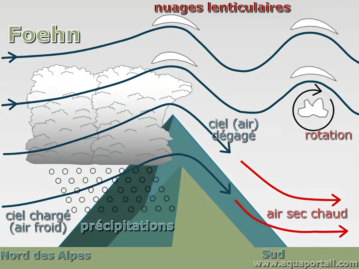 Dans les Alpes, les vents de foehn entraînent des hausses de température notables, une baisse de l'humidité et de fortes rafales sur le versant sous le vent de la chaîne de montagnes. Ces vents se forment lorsque de l'air humide s'élève au-dessus des montagnes, se refroidit et provoque des précipitations sur le versant au vent. Une fois déshydraté, cet air redescend sous le vent, se réchauffant rapidement et perdant également de l'humidité. Cette séquence est à l'origine des rafales chaudes, sèches et puissantes caractéristiques des vents de foehn. Illustration du terme Foehn et ses synonymes en image.