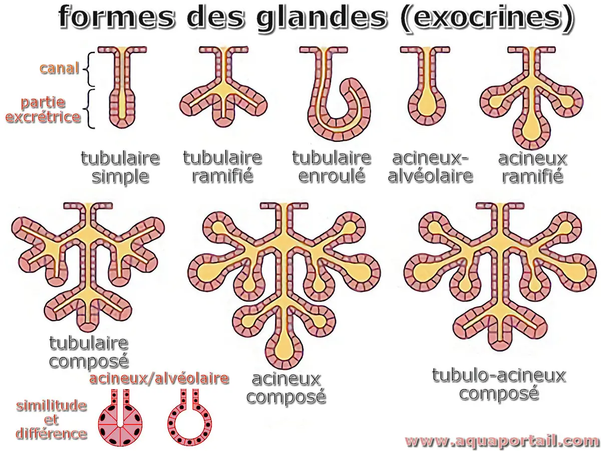 Les glandes peuvent être classées selon leur forme après le canal glandulaire en tubulaire, acineuse ou alvéolaire. La forme tubulaire peut aussi être enroulée (comme un "J"). Les glandes alvéolaires peuvent se substituer aux glandes acineuses sur le schéma. Illustration du terme forme des glandes et ses synonymes en image.