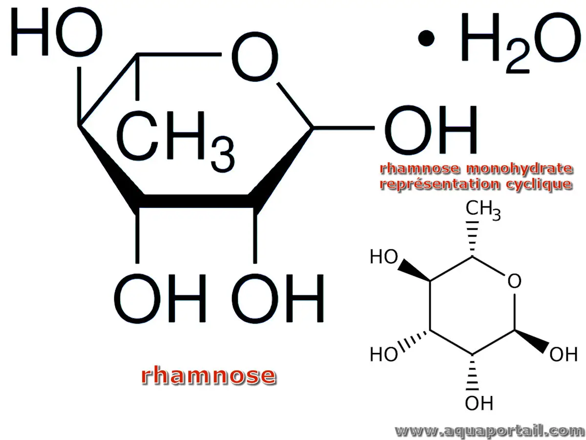 Le rhamnose est un sucre désoxylé, caractérisé par l'absence d'un atome d'oxygène. Il est également classé parmi les méthyl-pentoses et les 6-désoxy-hexoses. La molécule d'alpha-L-rhamnopyranose est la forme pyranose cyclique du L-rhamnose. Illustration du terme rhamnose et ses synonymes en image.