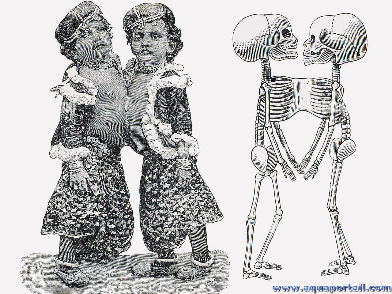 Des siamois xiphopages sont liés par le thorax; à droite, la réunion de deux squelettes xiphopages. Illustration du terme xiphopage et ses synonymes en image.