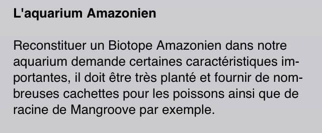 le biotope d'aquarium amazonien basique, c est des racines, une eau ambré chargé en particule, peu de vegetation (vivante) et un sol recouvert de debris, ce qui est pour nos bacs inconcevable, car on y verrait que dalle et niveau esthetique aussi.
