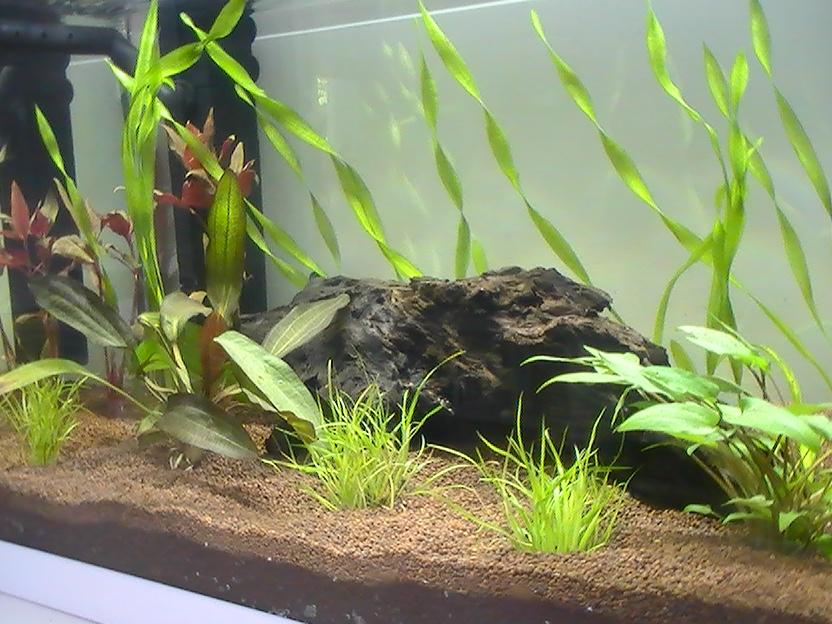 C'est un bac plutôt bien planté, avec des valisneria, nymphea lotus red, anubia var nana et 2 grosses racine.