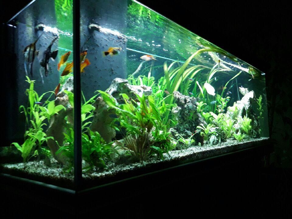 Mon 1er 260 litres 120x40x55 ils à 3 semaines incorporation de bactérie au début,filtre 900l/h avec ouate, mousse,céramique pas de charbon.