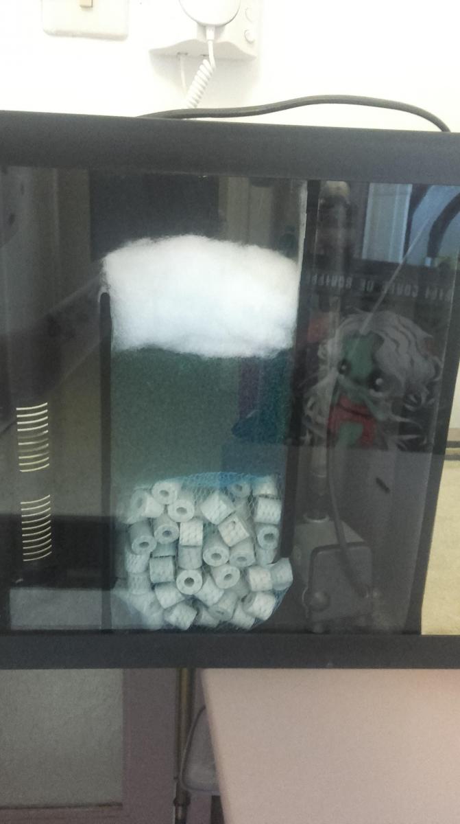 Mi Juin, j'ai décidée de ressortir mon aquarium de 60L après 4 ans de mise au placard.. j'ai vérifier la mise en eau, je l'ai nettoyer, puis j'ai fait mi dans le filtre un filet de cermec, un bloc de mousse, et de la ouate symec. (d'après mon souvenir c'était comme ça que j'avais procéder à l'époque)