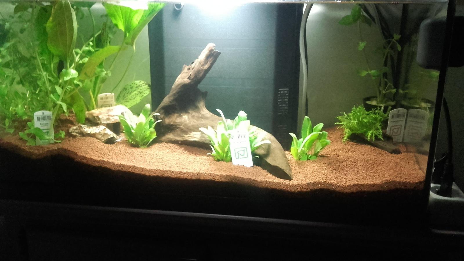 Pour les plantes tu pourrai rajouter des vallisneria spiralis (difficile d'en trouver des fois) devant le bac à décantation pour le cacher en avançant un peu la racine que la base puisse bénéficier de la lumière ou de l egeria densea en la l estant (l avantage c'est qu'elles sont à pousse rapide)