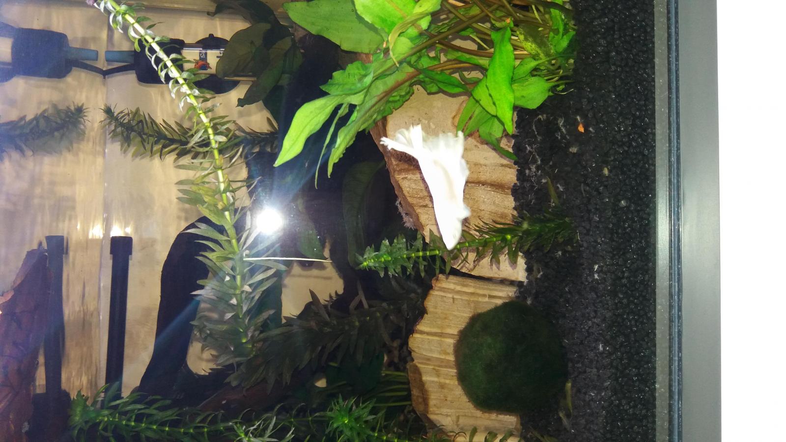 Mon aquarium fait 30 litres,chauffé filtré,plantes naturels,graviers pas de substrat par contre,2 pierres grises spéciales aquarium et donc cette fameuse racine. Ma population un seul combattant halfmoon white.