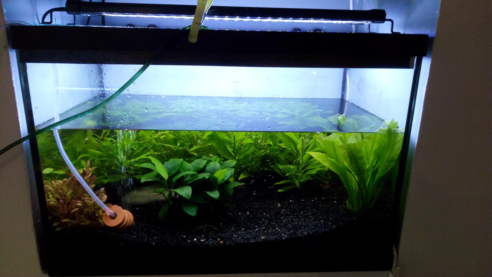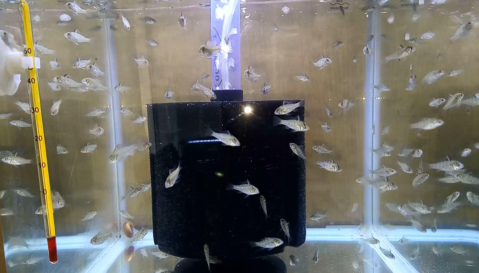 Malgré cela j'ai fini par enlever le filtre car je trouvais que le courant était trop fort pour des alevins nouveaux-nés, même en dirigeant les orifices de la canne de rejet vers la vitre.