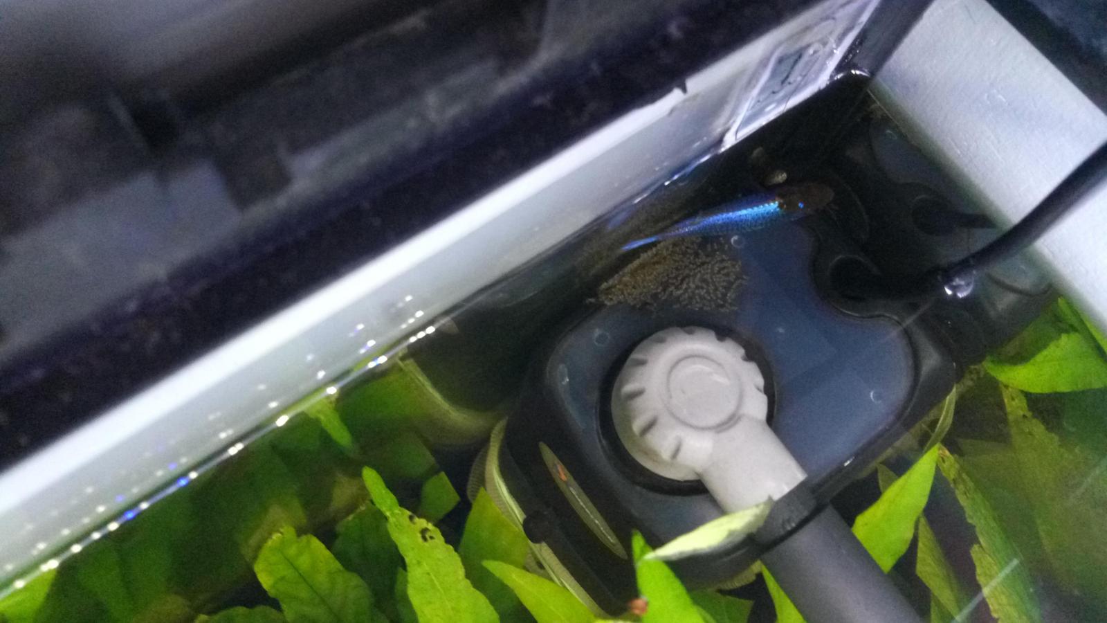 J'avais pris soin de mettre uns chaussette de nylon autour de mon filtre intérieur pour éviter que les alevins y soient aspirés.