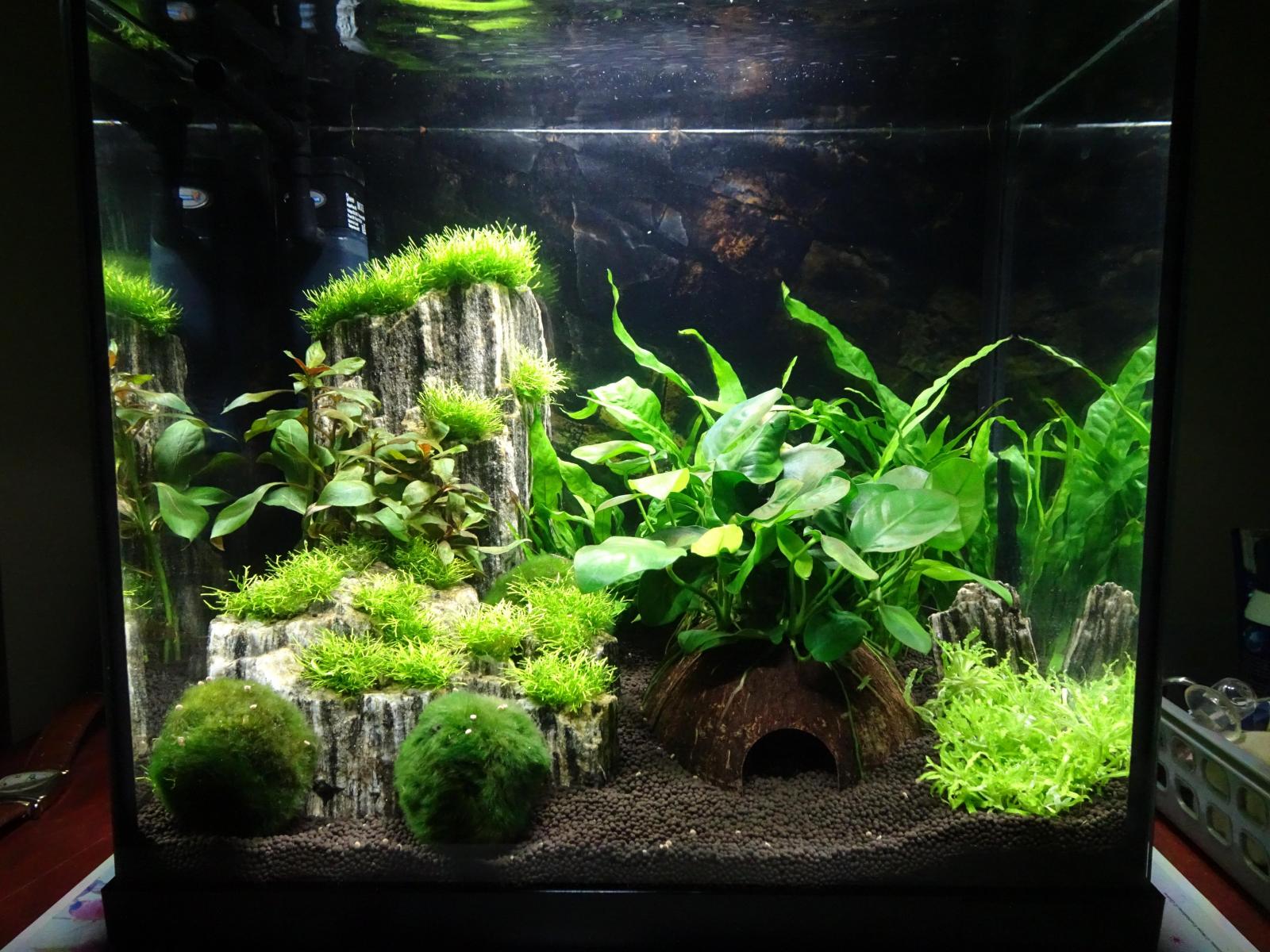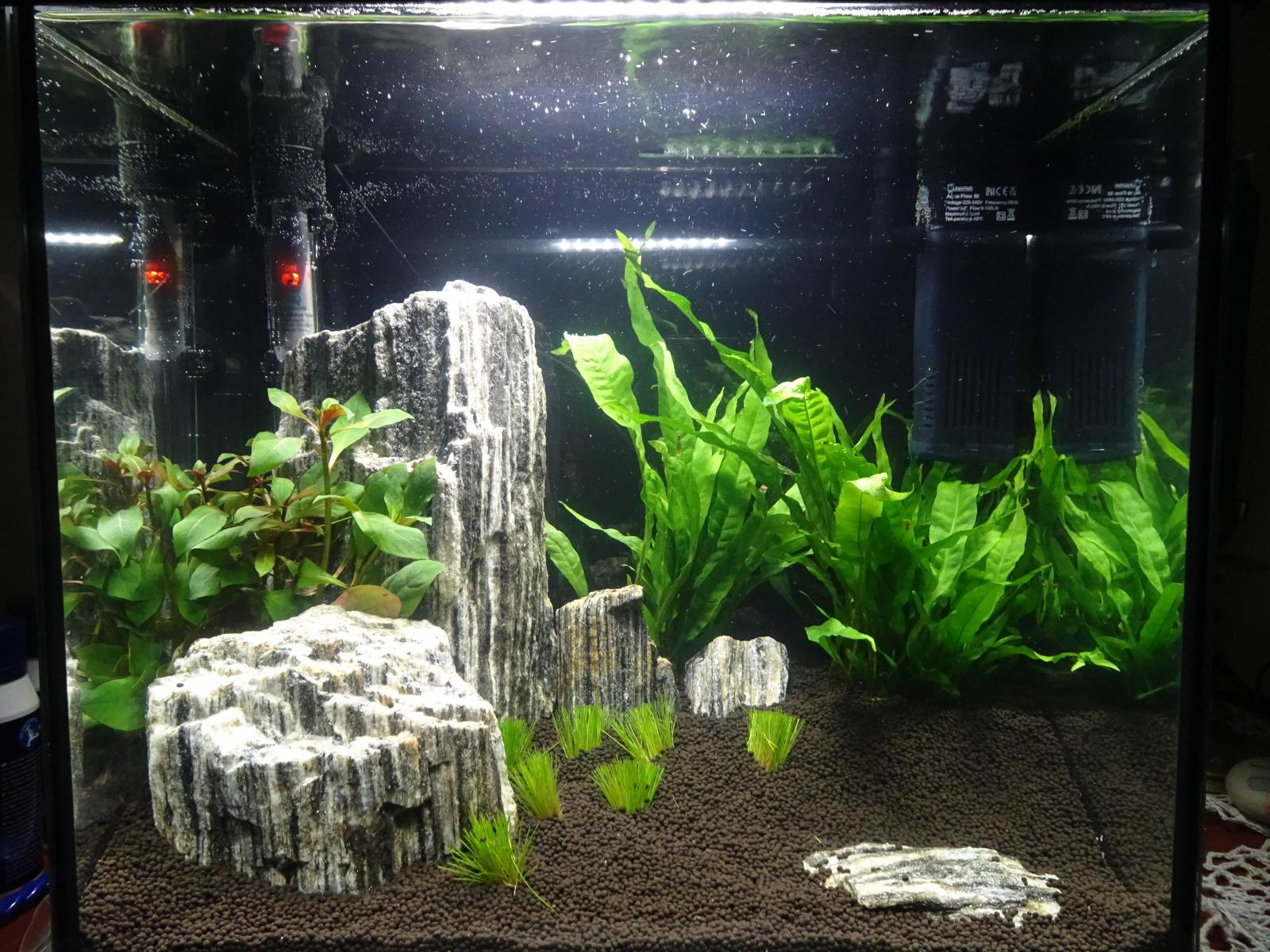J'ai eu un premier bac de 60L (guppy platy) et après quelques années de pause me revoilà lancé avec un nano de 25L pour accueillir des crevettes naines