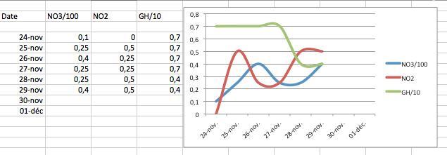 Mes bandelettes m'indiquent NO2 0,25mg/L et NO3 25mg/L.