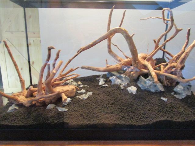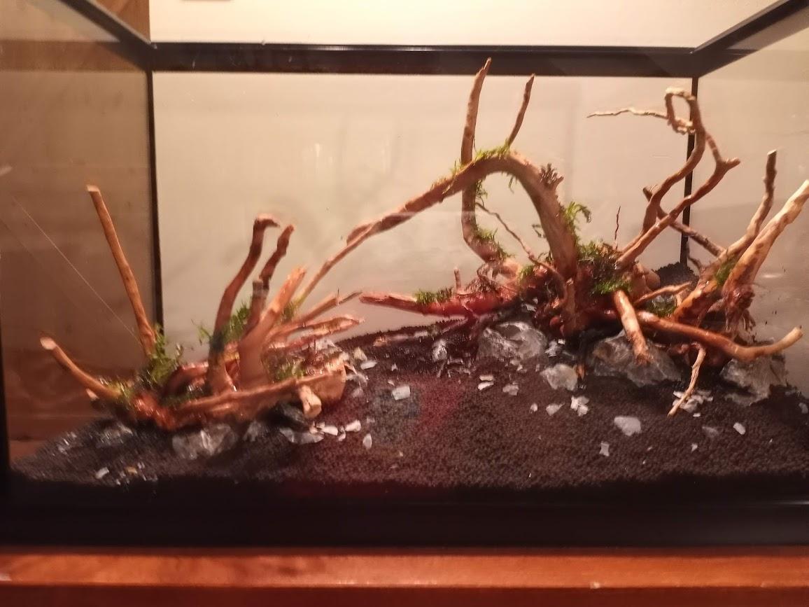 L'entretien était dur et les poissons et crevettes appréciaient moyennement. Due à un accident durant mon absence, la totalité de mes crevettes et la moitié de mes Boraras brigittae sont décédés. Bref, en aquario, ça n'allait pas très bien, mon betta était tombé malade d'une maladie que je n'ai toujours pas identifiée, mais il était au fond du bac et ne mangais plus donc j'ai décidé de l'euthanasier... Un dur moment, mais il commencait à se faire vieux. Donc mon 20l était vide et mon 60l quasiment, bof bof. Bref, j'ai tout vidé mais l'aquariophilie me manquait trop, j'ai donc décider d'en faire un aquascape.