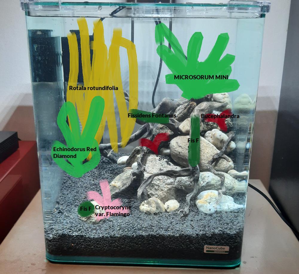Vu la taille de l'aquarium 25x25x30cm, il me faut des petites plantes. Je compte commander une fois mon cyclage dans le noir terminé mes plantes et les deux écrevisses CPO. Je vais réutiliser des rejets de mon 54L et acheter 3 nouvelles :
