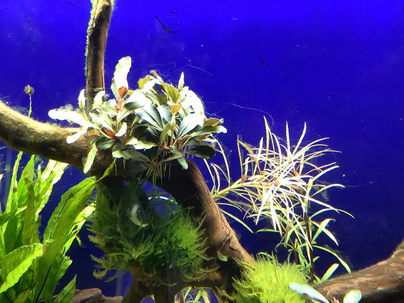 Les premières plantes, excepté la Cryptocoryne située devant la racine, enterrées dans le sable ont très vite dépéri du fait d,un excès d'engrais. Du coup, j'ai retiré une grande partie des boules d'engrais qui avaient déjà commencé à se réduire en poudre.